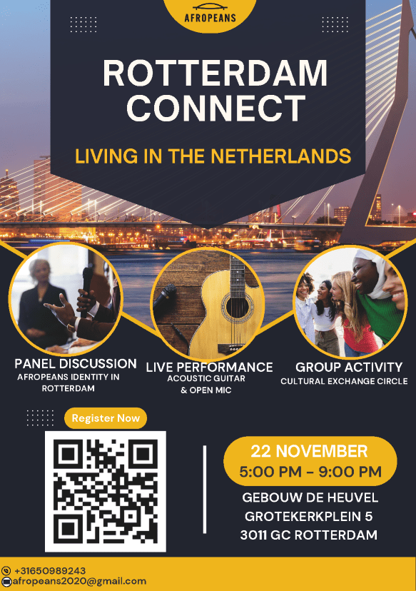 Join Stichting Afropeans on Saturday 22nd of November ’25 at 5:00 – 9:00 pm for an evening of conversations, performance and creativity! Enjoy an open mic, engaging discussions and connection with Rotterdammers from all walks of life coming together to meet, share, and celebrate the community.